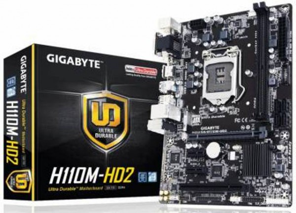 Gigabyte GA-H110M-HD2 ( ddr4 ) : all-in-one LGA1151(sKylake) mb – 2x smart fans connectors 3D UEFi dual BiOS , with USB blocker2 security to block unwanted USB connection , with FBT RST SCT RRT( no SRT SBA ) – intel H110 chipset 2x dual channel DDR4-2133 upto 16Gb 4x SATA6G on-board VGA with tripple outputs ( DVi HDMi d-sub ) ALC887 7.1 HD audio ( dedicated PCB for analog/digital with LED trace path dedicated PCB layer for left/right channel ) realtek gigabit lan ; 1x PCi 2x pci-e (1x) 1x pci-e (16x) with 2x USB3.0 2x USB2.0 ( one fuse per USB ) support optional serial parallel port add-on cable 2x PS2 – m-atx”
