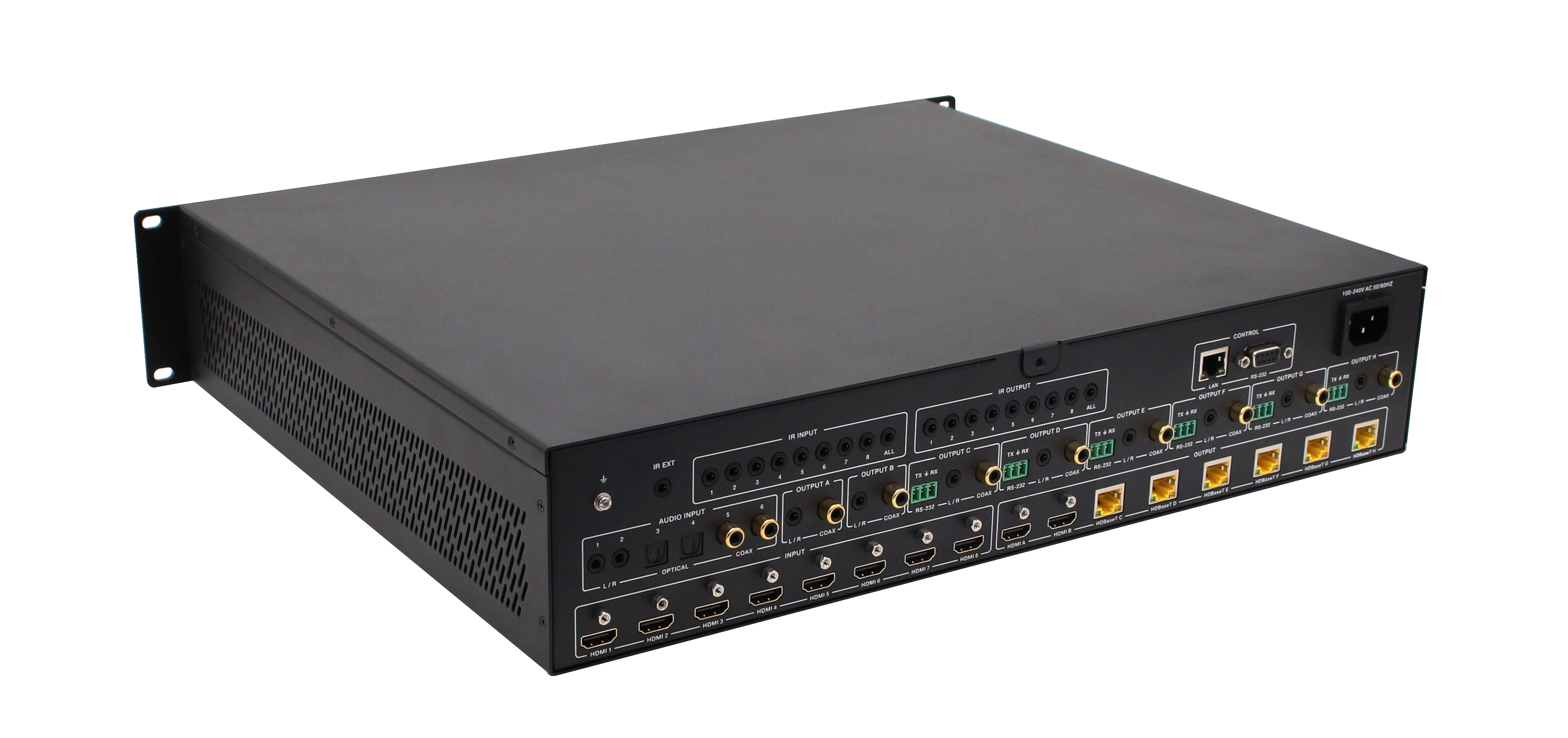 The HDBaseT 8×8 matrix switcher supports the transmission of video (up to 4K2K@60Hz 4:4:4, 18Gbps, HDCP 2.2) and multi-channel digital audio from 8 HDMI 2.0 sources to 6 HDBaseT outputs and 2 independent HDMI 2.0 outputs. The HDBaseT outputs allow transmission via a single CAT5e/6/7 cable up to 330 feet/100 meters and the independent HDMI outputs support cable lengths of up to 33 feet/10 meters. The matrix switcher built-in an independent audio matrix switching with 16 audio outputs (8 audio break outs, 6 HDBaseT outputs and 2 HDMI outputs) and 22 audio inputs (8 HDMI inputs, 8 ARC audio inputs and 6 external audio sources) with volume/mute/delay adjustment. It supports flexible control through on-panel buttons, IR remote control, RS-232 or Web GUI.